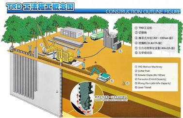 TRD工法是將植入地下的鏈鋸型切割箱與主機(jī)連接,使其橫方向移動(dòng),挖掘成溝槽后注入固化液,并與原土進(jìn)行混合?攪拌,在地下造成等厚連續(xù)墻的工法。